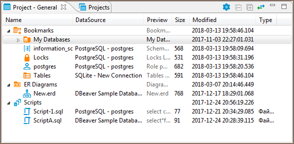 The Project Explorer displays the content of a project with metadata. The content includes: Bookmarks, ER Diagrams, and Scripts. The metadata appears in columns which you can hide or show.