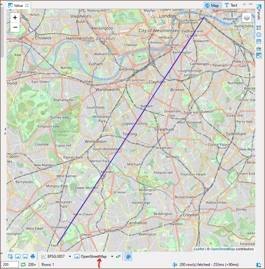 DBeaver ships with several predefined map tiles. The tiles can be chosen with the combo below the viewer: