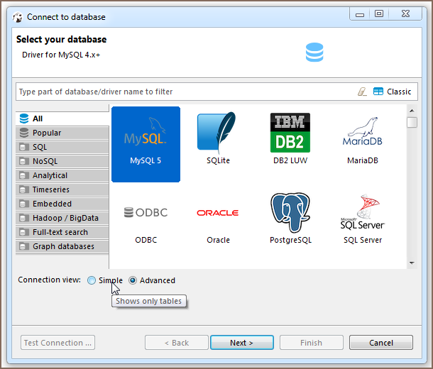 To quickly find the needed driver, you can type a hint in the text field above the list of drivers. If you cannot find a driver for your database then probably there is no suitable driver and you need to create one. Please see Database Drivers article.