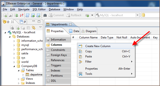• Go to 'employees' table, 'Foreign Keys' tab. Right click on the screen -> Create New Foreign Key ,