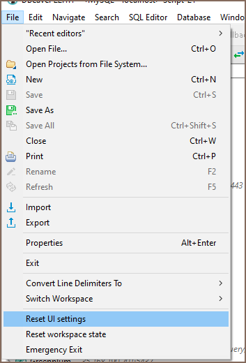 To reset DBeaver UI press Reset UI settings button in the File menu: