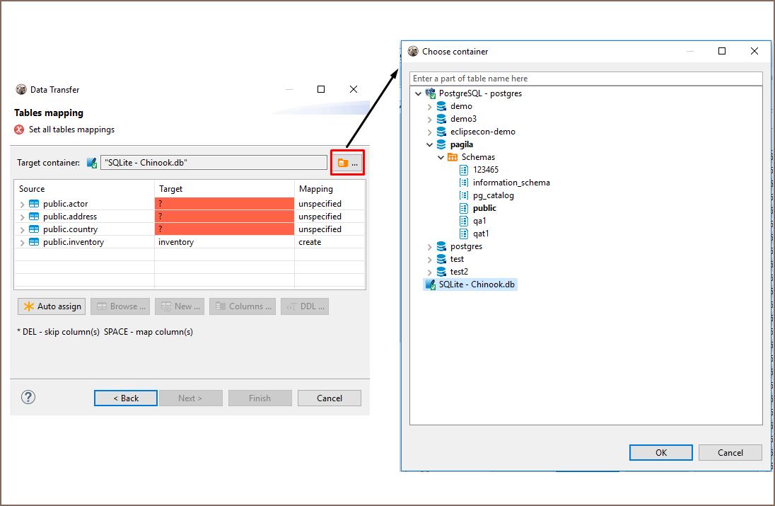 If you want tables of the target container to be named like those of source, press the Auto assign button