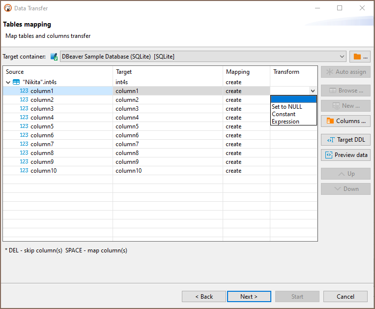 You may also want to transform the values of some columns during the transfer. To do that, define column transformers by clicking on corresponding cells in the Transform column. You can choose one of three options: