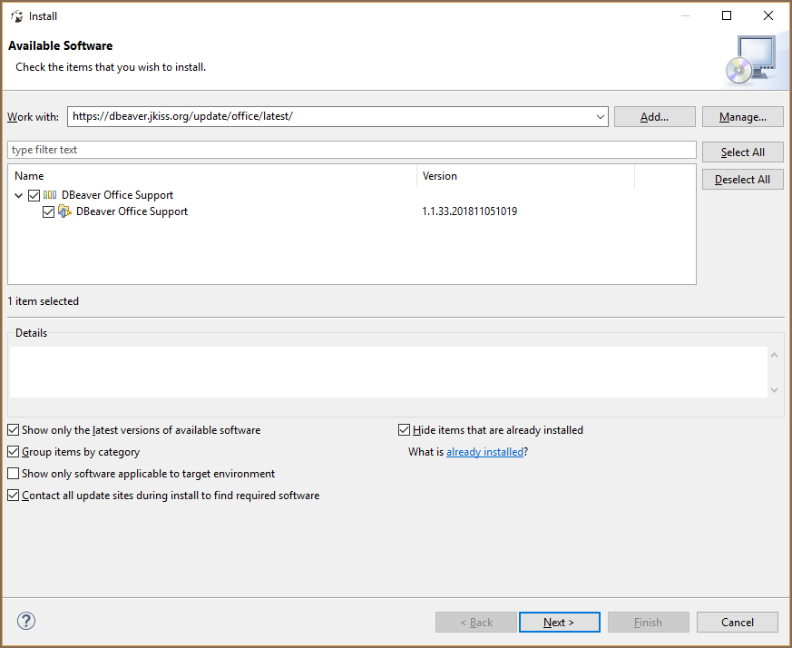 - Click Next->Finish. The installation will take some time. Restart DBeaver.