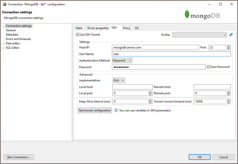 You can connect directly to a server or use SSH tunneling or SOCKS proxy. You can specify server address as a host/port/database configuration or you can enter the target database URL with all necessary parameters: