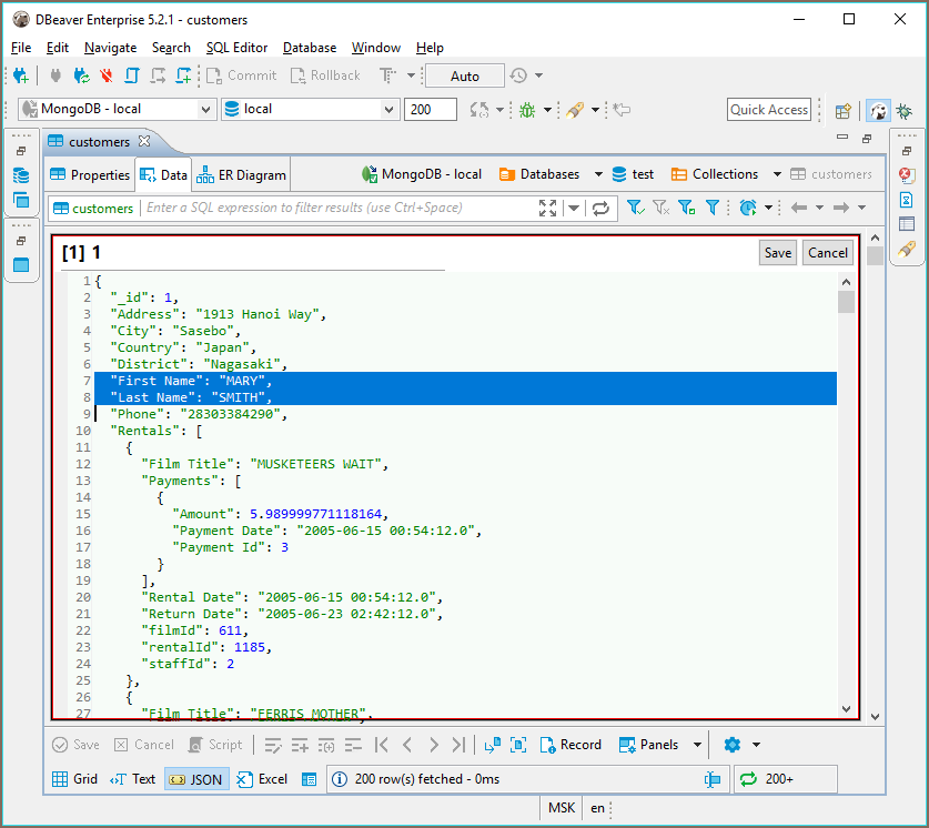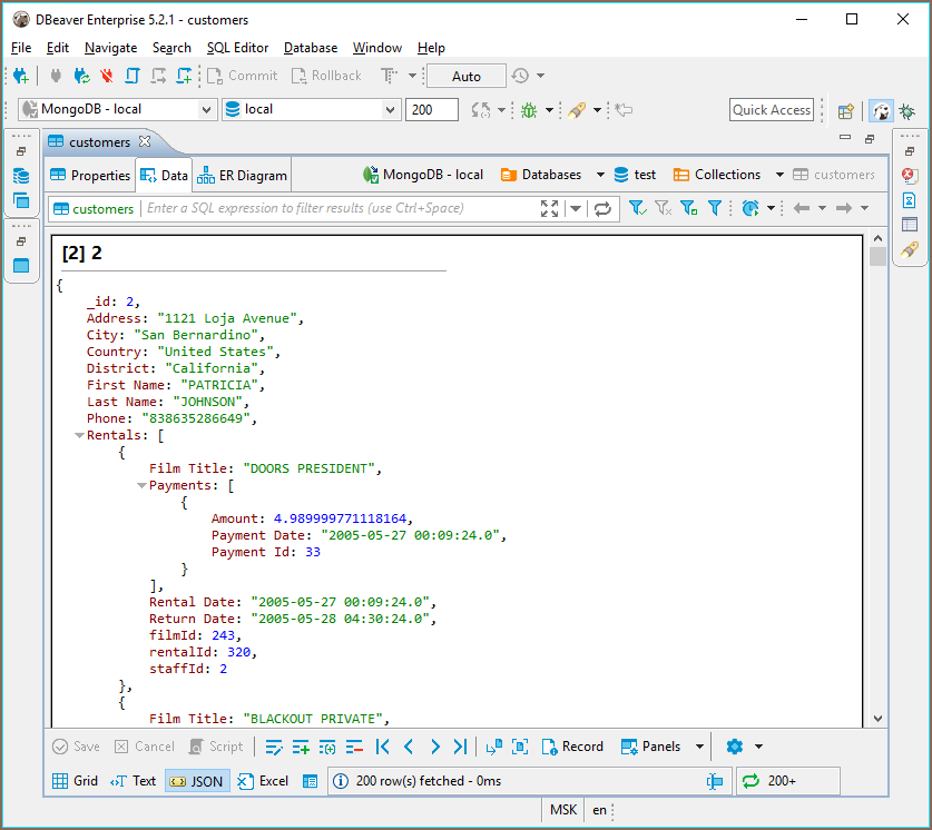 You can view/edit MongoDB collections content as standard relational tables (grid/plain text presentations) or as JSON documents. The presentation can be switched in the Results Viewer toolbar. In a grid, DBeaver will try to unify all documents in some particular collection (as they have the same structure/the same set of properties).