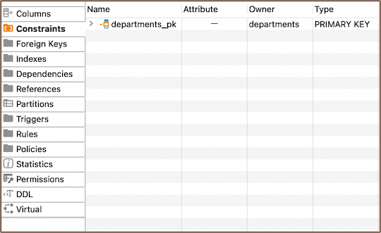 - In the Properties editor, move to the Constraints tab of the corresponding table, right-click on the pane or window, and Create New Key from the context menu.