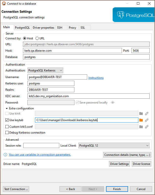 A keytab is a file containing pairs of Kerberos principals and encrypted keys (which are derived from the Kerberos password). You can use a keytab file to authenticate various remote systems using Kerberos without entering a password. However, when you change your Kerberos password, you will need to recreate all your keytabs. Keytab files are commonly used to allow scripts to authenticate automatically using Kerberos without requiring human interaction or access to a password stored in a plain-text file. The script can then use the acquired credentials to access files stored on a remote system. For DBeaver, it means that when you use a keytab file, you still need to provide all of the credentials other than a password. You can find this setting in the "Extra configuration" section.