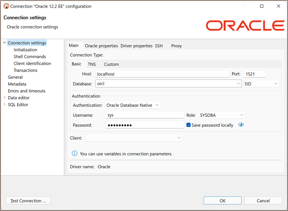 | Save password | Saves the user/password information in the local DBeaver configuration | SID |