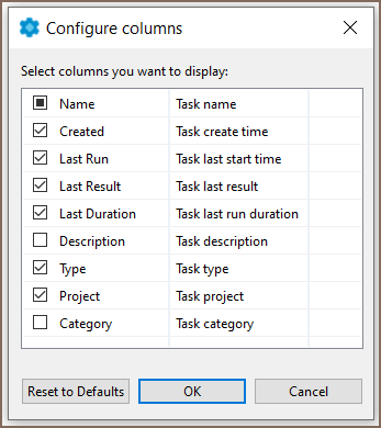 You can configure the Database Tasks View to see more or fewer View columns. Right-click inside the Database Tasks tab and choose the Configure columns button from the menu.
