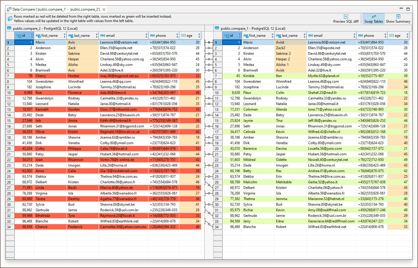 Here you can examine the differences, swap the panels using the Swap Containers button in the toolbar, or preview the summary including the statistics by using the Show Summary button in the toolbar too. Everything you can do in the regular data editor is possible to perform here - you can copy data or transfer it to another database, except modify the values.