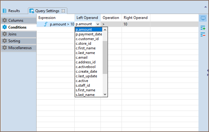 - Left Operand setting defines the left operand of the conditional expression. To set the left operand, click the cell in the Left Operand column and a drop down list of all available columns will be displayed. Select a column you want to use as the left operand in your conditional expression or insert a digit.