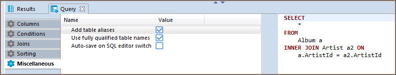 - Enable or disable the automatic generation of aliases for tables by selecting the Add table aliases check-box.