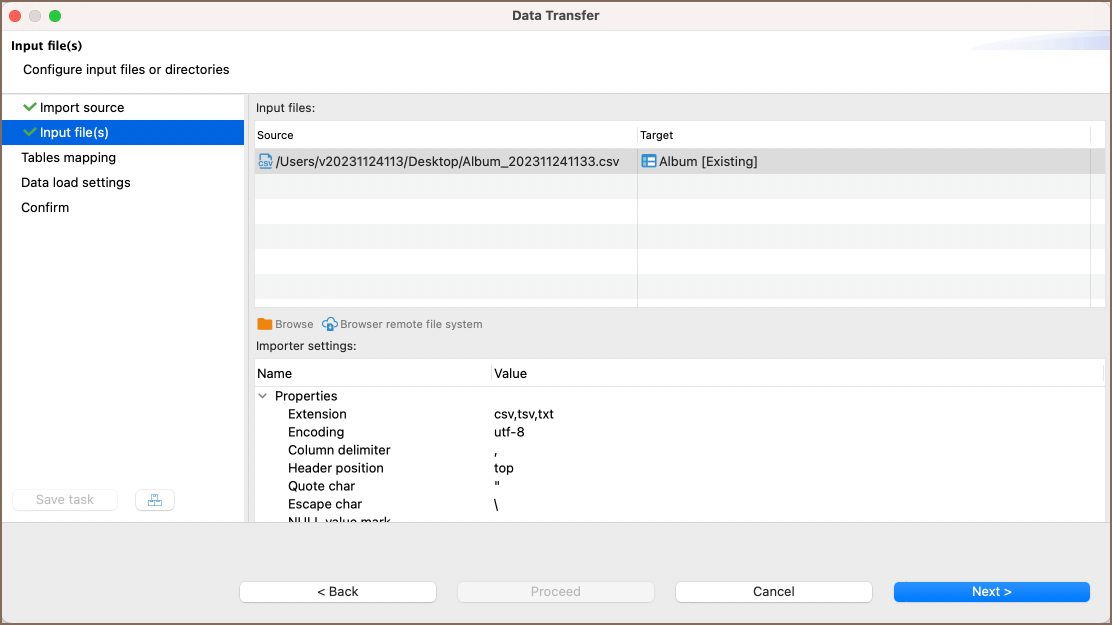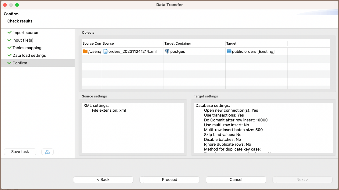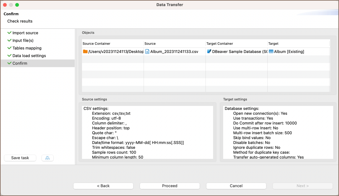 - In the final window, you can review all the settings you selected earlier. If you missed something, you can go back and adjust it. Once you are happy with everything, finish the import by clicking Proceed.