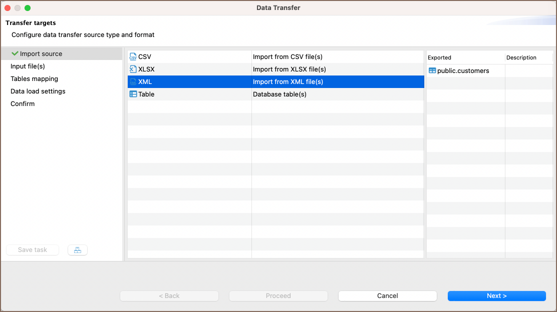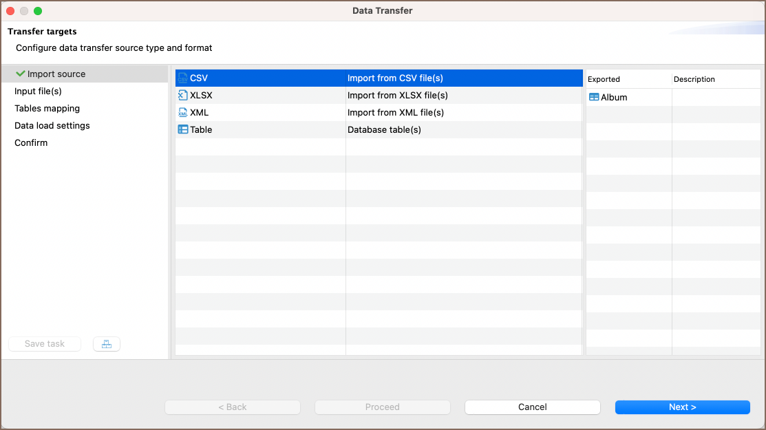 | Save task | Opens the Save Task window to assist in creating a task during the data transfer process. This window provides options and settings for creating and configuring a task related to the data transfer operation. |