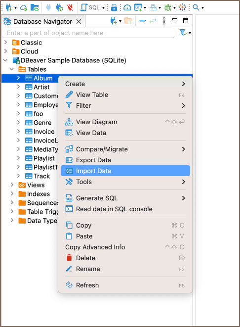 - Select the database table (or tables) where you want to import data. Do this by right-clicking on the table name in the Database Navigator section, then clicking on Import Data.