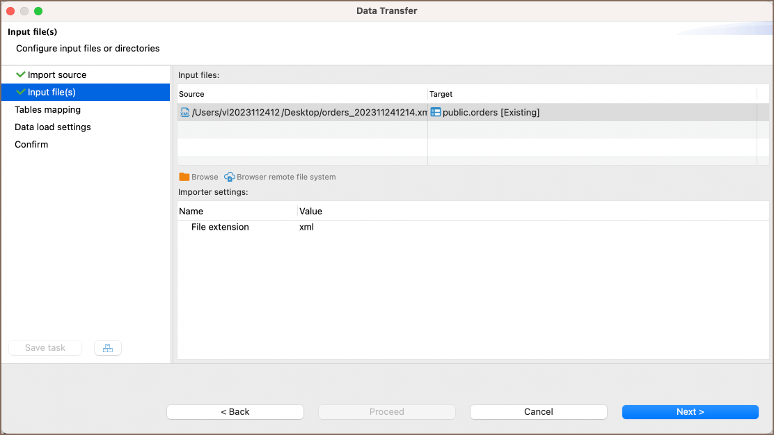 - Review which file(s.md) and to which table(s.md) you will import. You can also save all your settings as a task in this step: