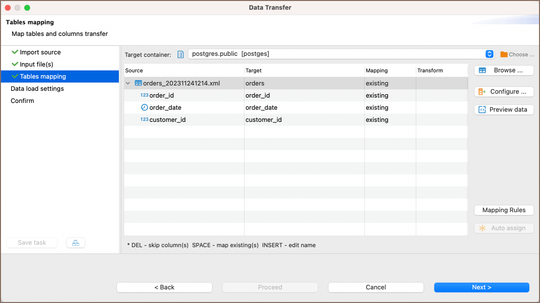 - In the next window set XLSX-to-table mappings. Please refer to our guide for detailed information on the mapping process.