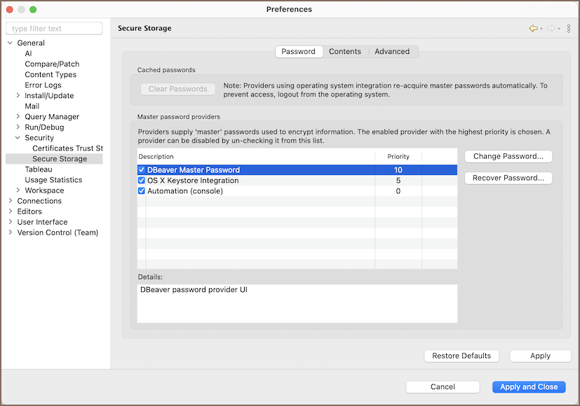 Under the Secure Storage section, accessible via the path Window -> Preferences -> General -> Security -> Secure Storage, in the Passwords tab, you have the following options: