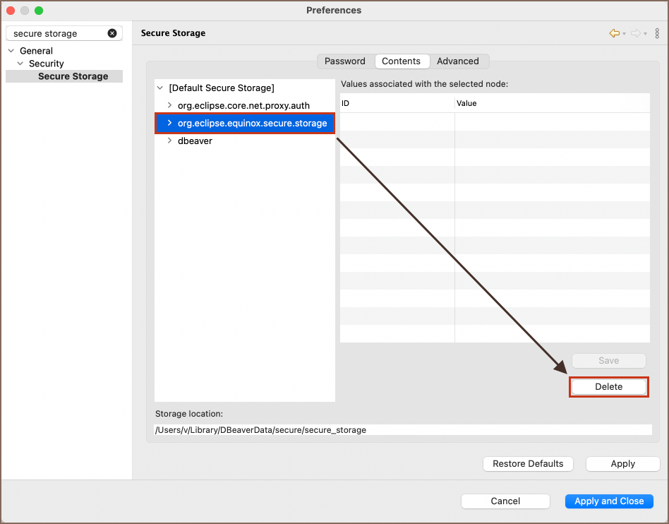 [Default Secure Storage]->org.eclipse.equinox.secure.storage. - Click on the Delete button.