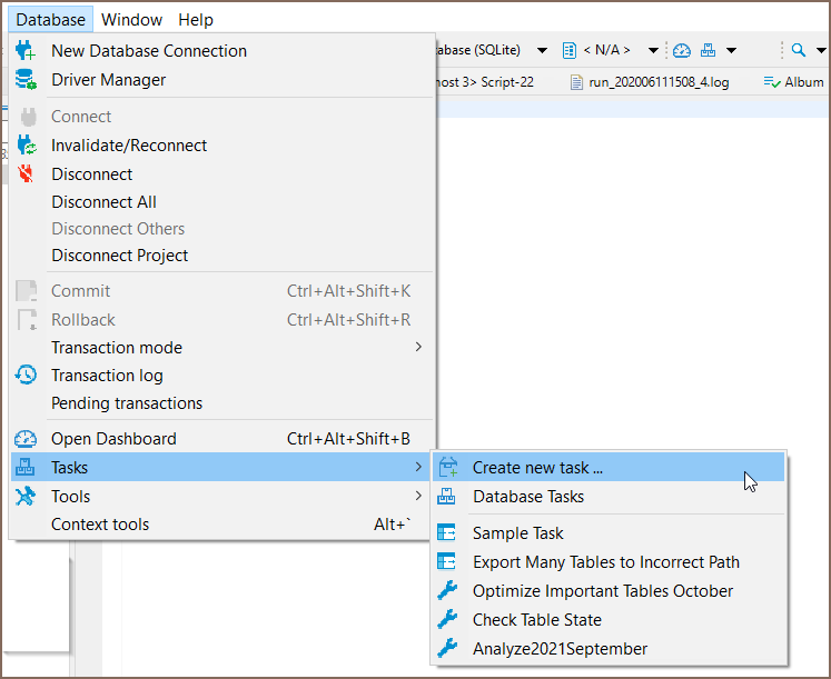 Also, you can create a new task from the main menu Database -> Tasks -> Create new task....