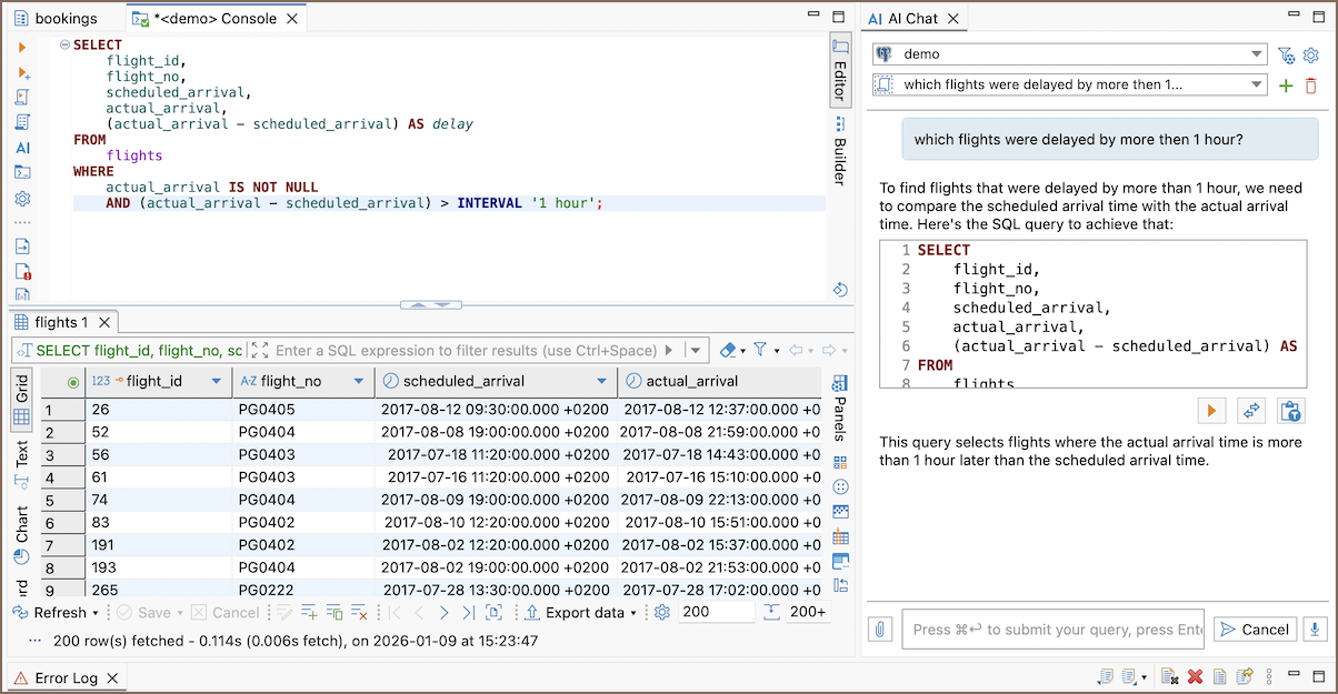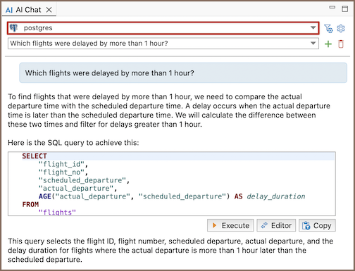 DBeaver provides AI Chat for working with databases in natural language. You can enter requests in plain text to generate SQL queries, get explanations, or ask questions about your databases.