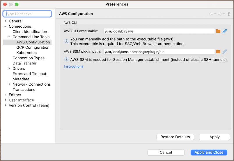 Before you can use AWS SSM with DBeaver, you need to specify the paths for the AWS CLI executable and the Session Manager Plugin. Follow these steps to configure the paths: