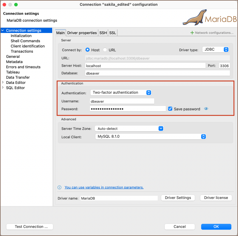 In addition to username/password authentication, DBeaver also provides an option for Two-Factor Authentication (2FA). This feature requires a secondary password, offering enhanced security for database connections.