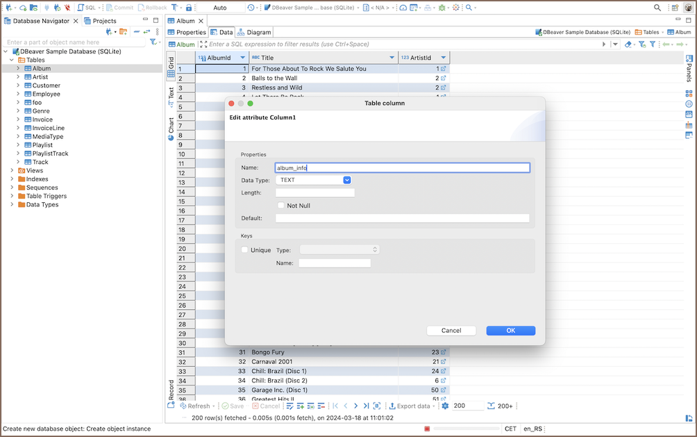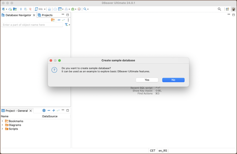 - Create Sample Database: The first window you may see is the Create Sample Database prompt. For those new to database management, or if you simply want to explore DBeaver's functionalities without starting from zero, this option is beneficial. It provides a pre-populated database with various data and objects, allowing you to practice and experiment without the need to populate a new database from scratch. For more detailed information, refer to our article on Sample Database.