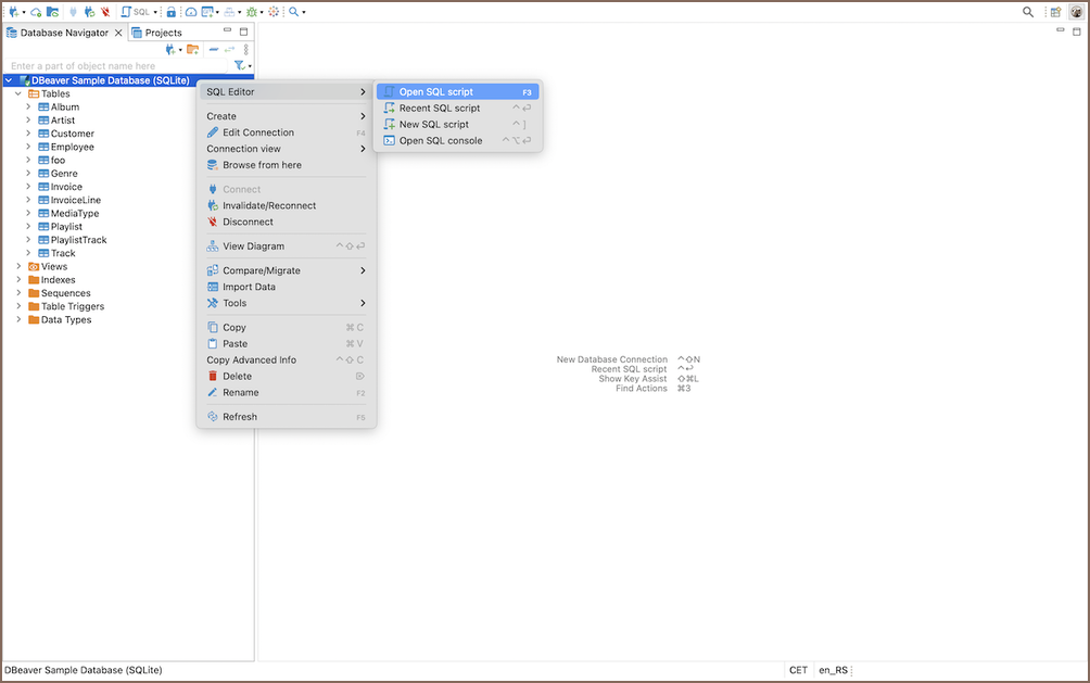 Open SQL Editor: Navigate to the database or schema in the Database Navigator, right-click, and select SQL Editor -> Open SQL Script.