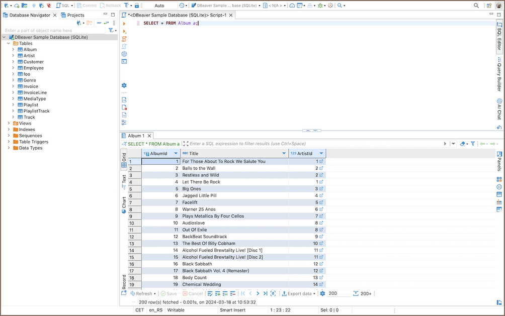 Enhance your query writing with these powerful features: - AI SQL Assistance: Utilize AI to suggest optimizations and best practices for your SQL queries. - SQL Code Editor: Enhance the behavior of the Script panel, focusing on features like displaying problem markers, automatic closing of quotes and brackets, semantic analysis, and more. - Spelling: Improve the accuracy of your SQL scripts with integrated spelling correction.