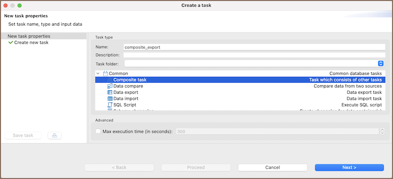 In the Create a task wizard, select Composite task. Enter a name, and optionally add a description and a task folder. Click Next to continue.