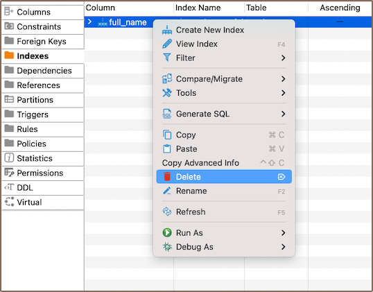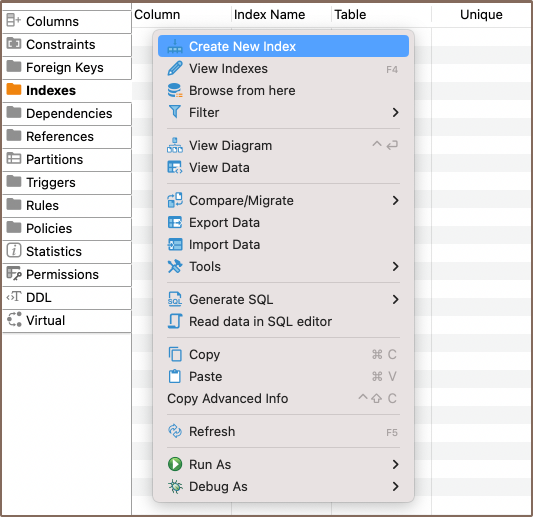 - Using the Database Navigator: Navigate to the database where the table you want to add a index to is located. Find and select the table for which you want to create a new index. Within the selected table, you'll find a folder named Indexes.