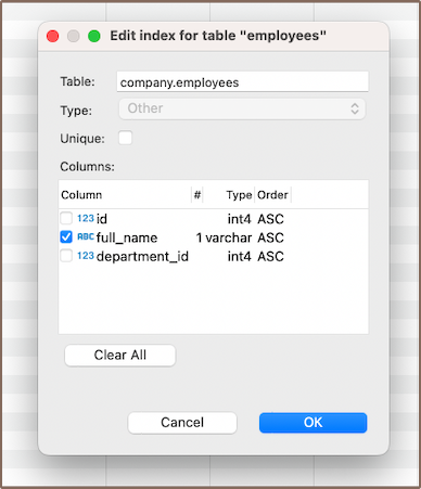 - After you've chosen the column(s) for your index and configured any additional settings, you can finalize the creation of the index by clicking OK.