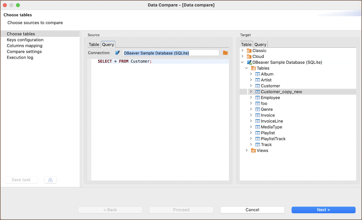 DBeaver provides functionality to compare two tables or query results, which is useful when you need to identify minor differences in datasets that appear almost identical. This capability is essential for tasks such as: