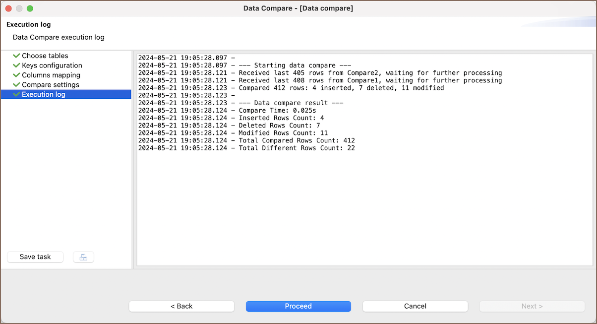 Once you have configured all settings and clicked Proceed, the Data Compare wizard will perform the comparison operation: