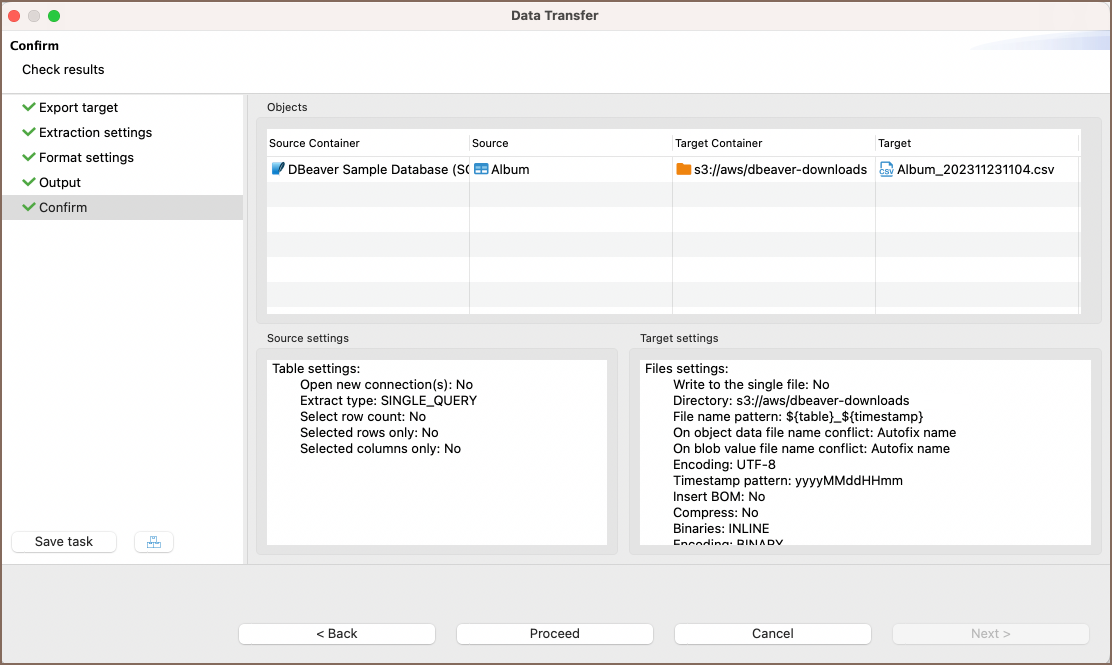 Review what you want to format and which format you will export. You can also save all your settings as a task in this step or change the task variables: