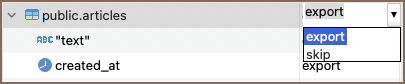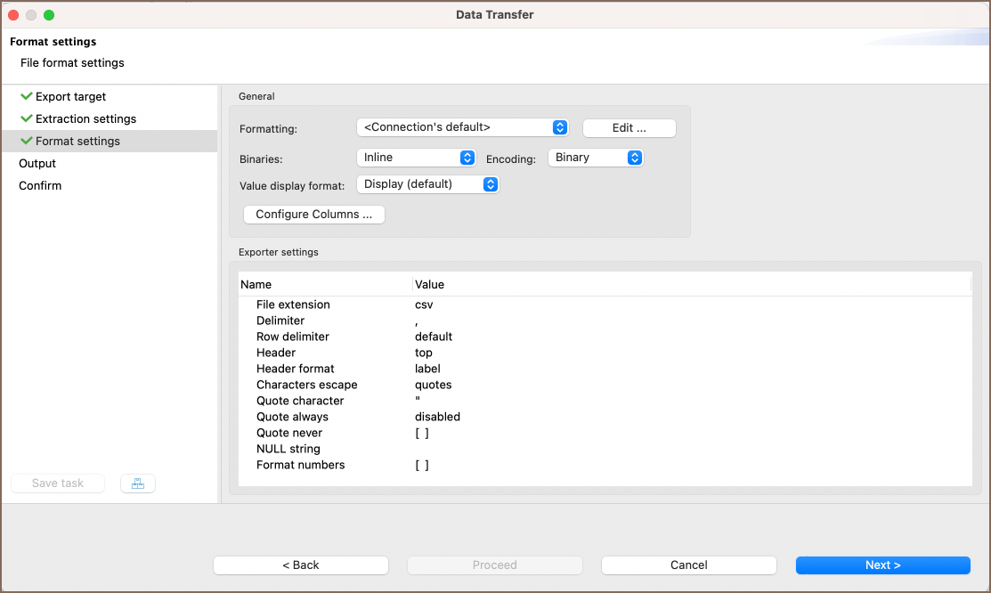 Setting name Description Formatting Selects the formatting settings for the exported data. Reed more in the related article Binaries Specifies how binary data is represented in the export. Encoding Sets the character encoding for the exported file. Value display format Chooses the format for displaying values in the export. Configure columns Allows you to set which columns to export. Configure the columns to export by clicking Configure. In the Action column, use the down arrow on a row to toggle between skip or export for that column/table.