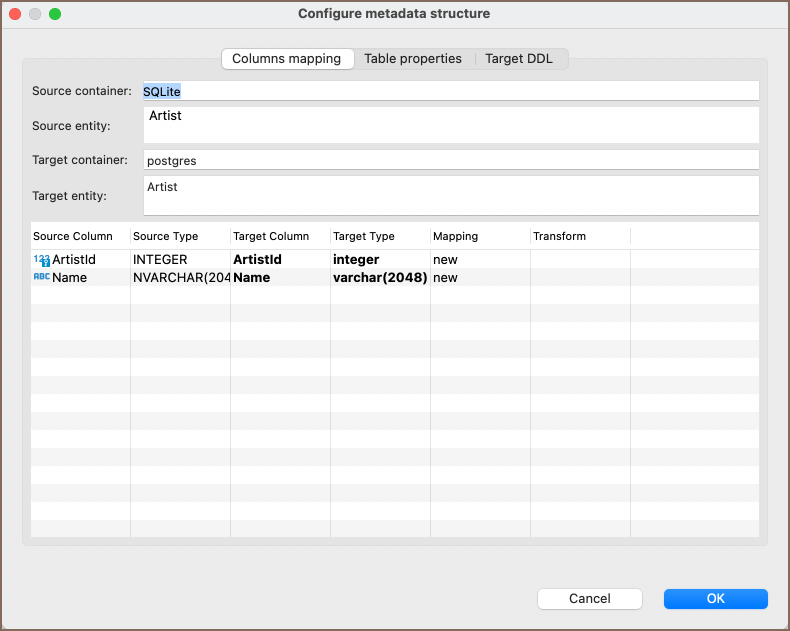 You may also want to transform the values of some columns during the transfer. To do that, define column transformers by clicking on corresponding cells in the Transform column. You can choose one of three options: