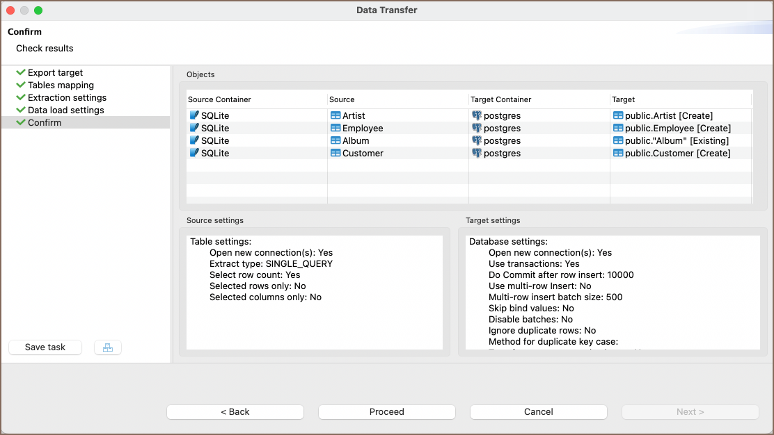 The final step before initiating the data transfer is the Confirm tab. This tab provides a summary of all configurations set up in the previous steps. It serves as a last review to ensure all settings are correct.
