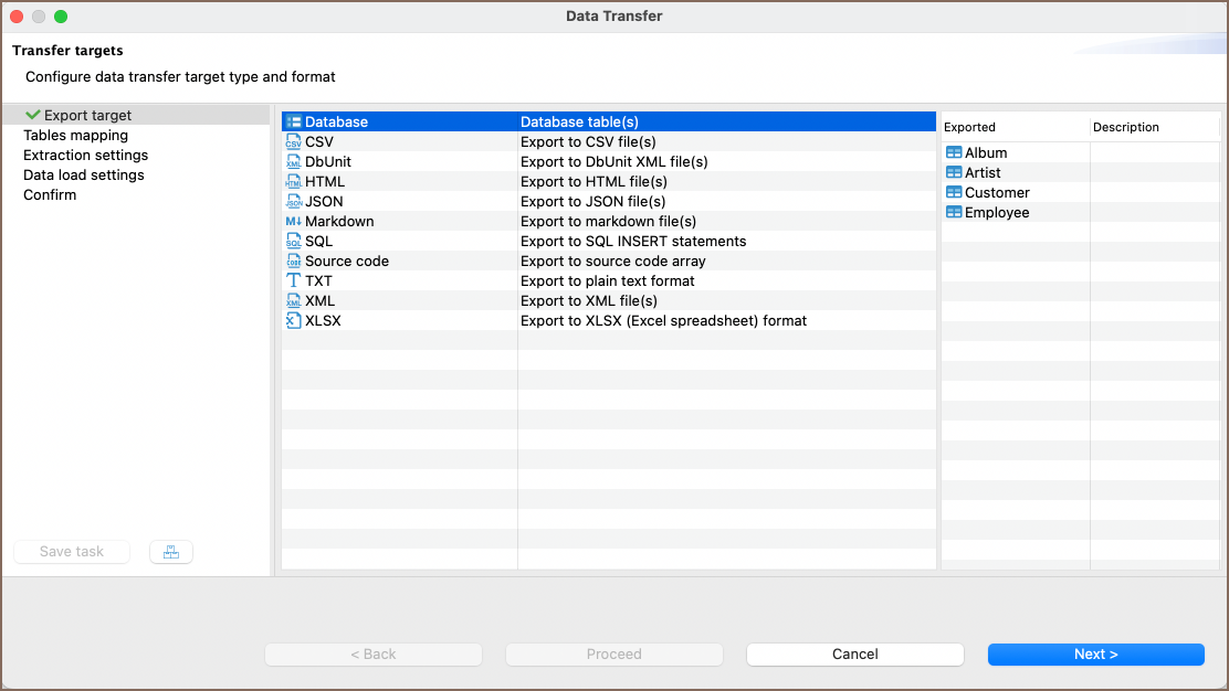 After selecting the data source, the next step is to specify the type of destination for the data transfer. Choose Database type as the data transfer target and press Next.