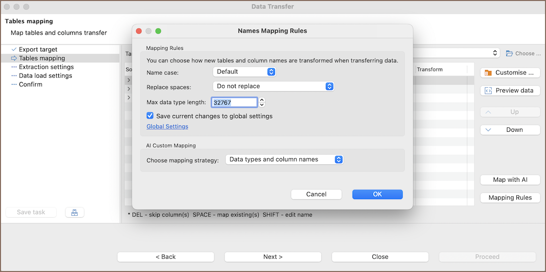 Clicking the Mapping Rules button opens a window that provides options for customizing how new tables and column names are transformed during the data transfer.