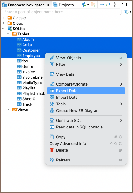 Alternatively, you can export data from a custom SQL query. Execute the query and then choose Export Data from the results context menu.