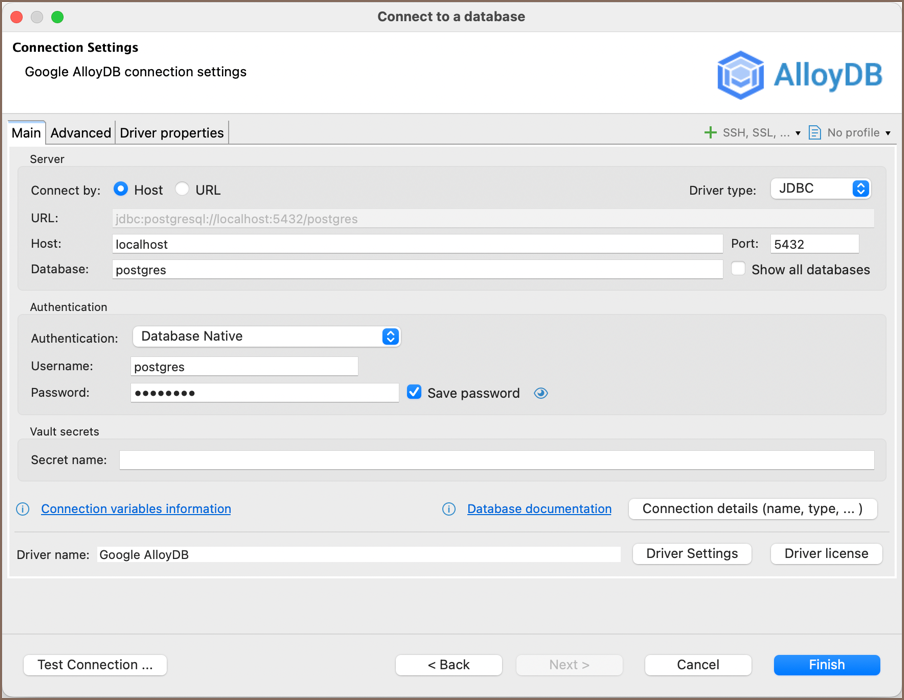 You can also read about security in DBeaver PRO.Local Client Specify the local client, see our article about local client configuration. Session role This option allows you to define a specific role that your database session assumes upon connection. Setting a session role can be useful for managing permissions and access control within your AlloyDB database. Connection Details Provide additional connection details if necessary. Driver Name This field will be auto-filled based on your selected driver type. Driver Settings If there are any specific driver settings, configure them here. -