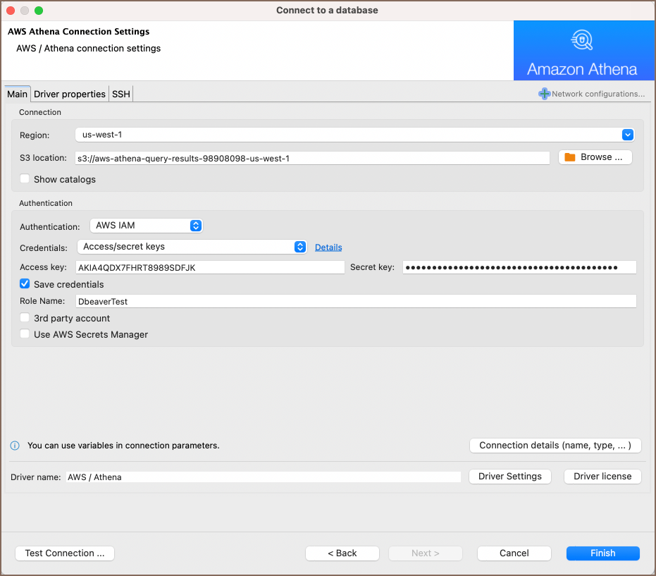 | Driver Settings | If there are any specific driver settings, configure them here. For detailed guide on driver properties please refer to the official AWS Athena documentation. |