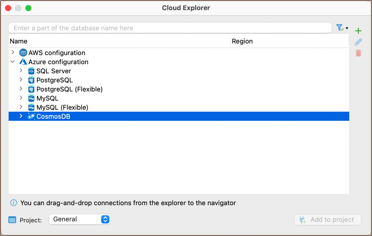 Unique to Cosmos DB, DBeaver provides the option to connect through the Cloud Explorer feature, specifically for Azure. This feature allows you to browse and manage your Azure resources directly from DBeaver. You can view your Cosmos DB instances, along with other Azure resources, in a structured tree view.