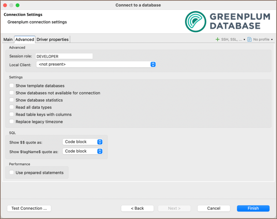 The second page of the connection settings offers additional options that allow you to customize your further connection to the Greenplum database.