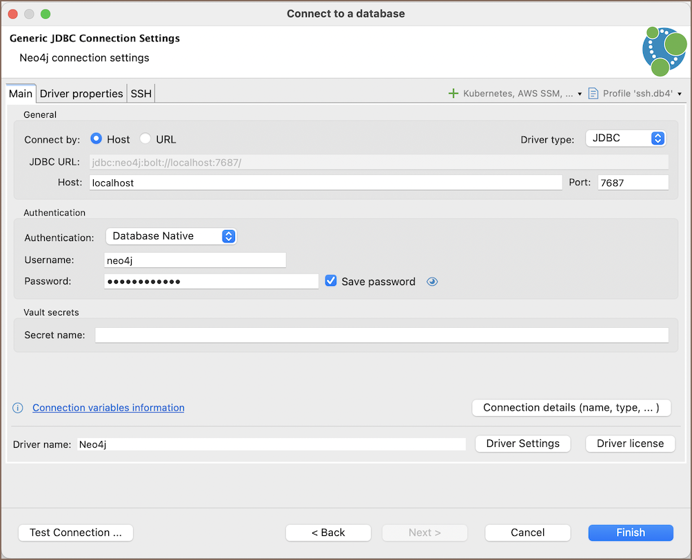 | Host | If you are connecting via host, enter the host address of your Neo4j database here. |