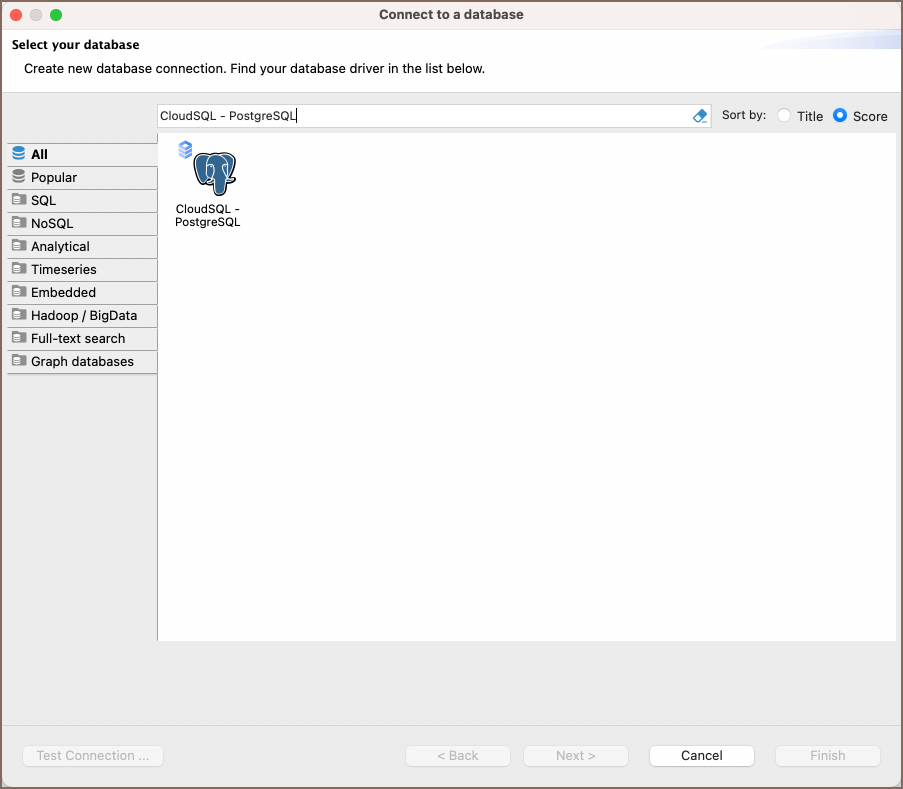 selecting the CloudSQL - PostgreSQL option to connect to the Google Cloud SQL service. If you have not yet created a