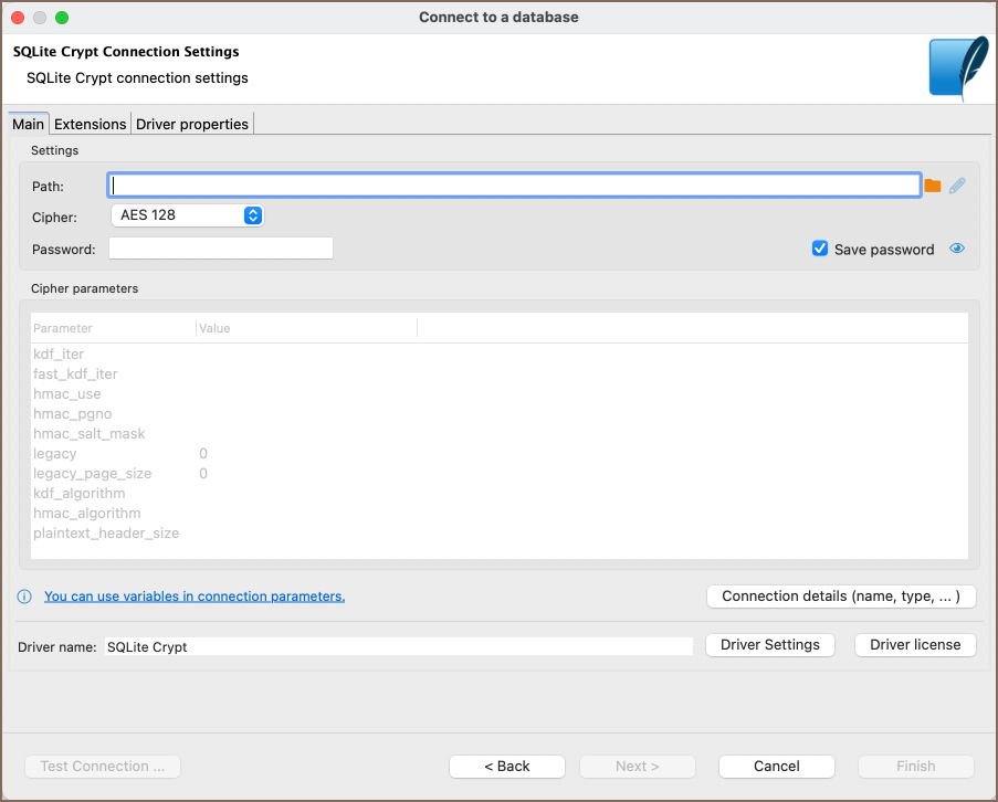 This subsection outlines the settings to establish a connection to encrypted SQLite databases.